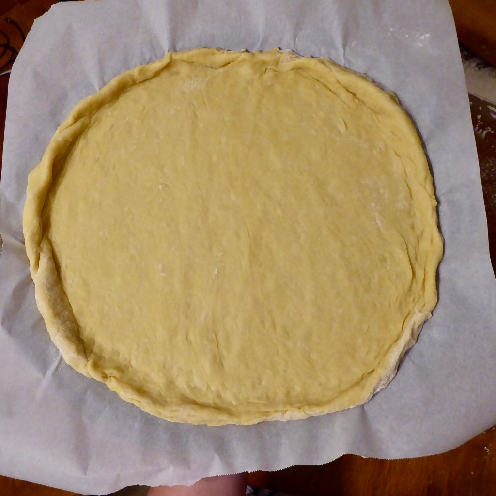 Roll dough out into a circle (or a square if you are somewhat geometrically challenged with a rolling pin) and make sure the edges are pinched up and slightly higher than the rest of the dough. Set it aside, preferably on a baking sheet or a pizza pan, while you make your filling.