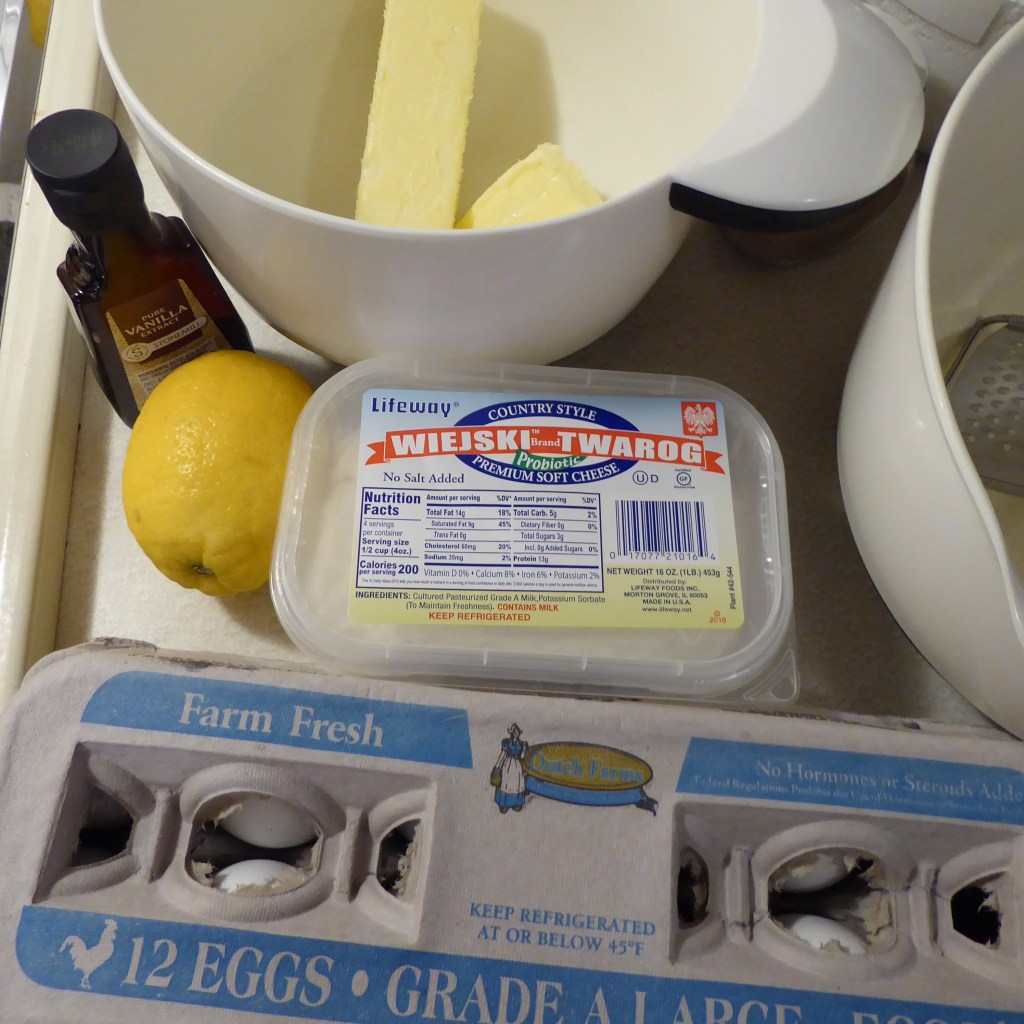 So, just to preface: farmer’s cheese is what you’re looking for at the grocery store. I went to my local ethnic foods grocery and picked up some Polish farmer’s cheese, pictured below. The texture is similar to a (bear with me) really dry cottage cheese. Delicious, right? I promise it is. Think, rum cheesecake kind of style.