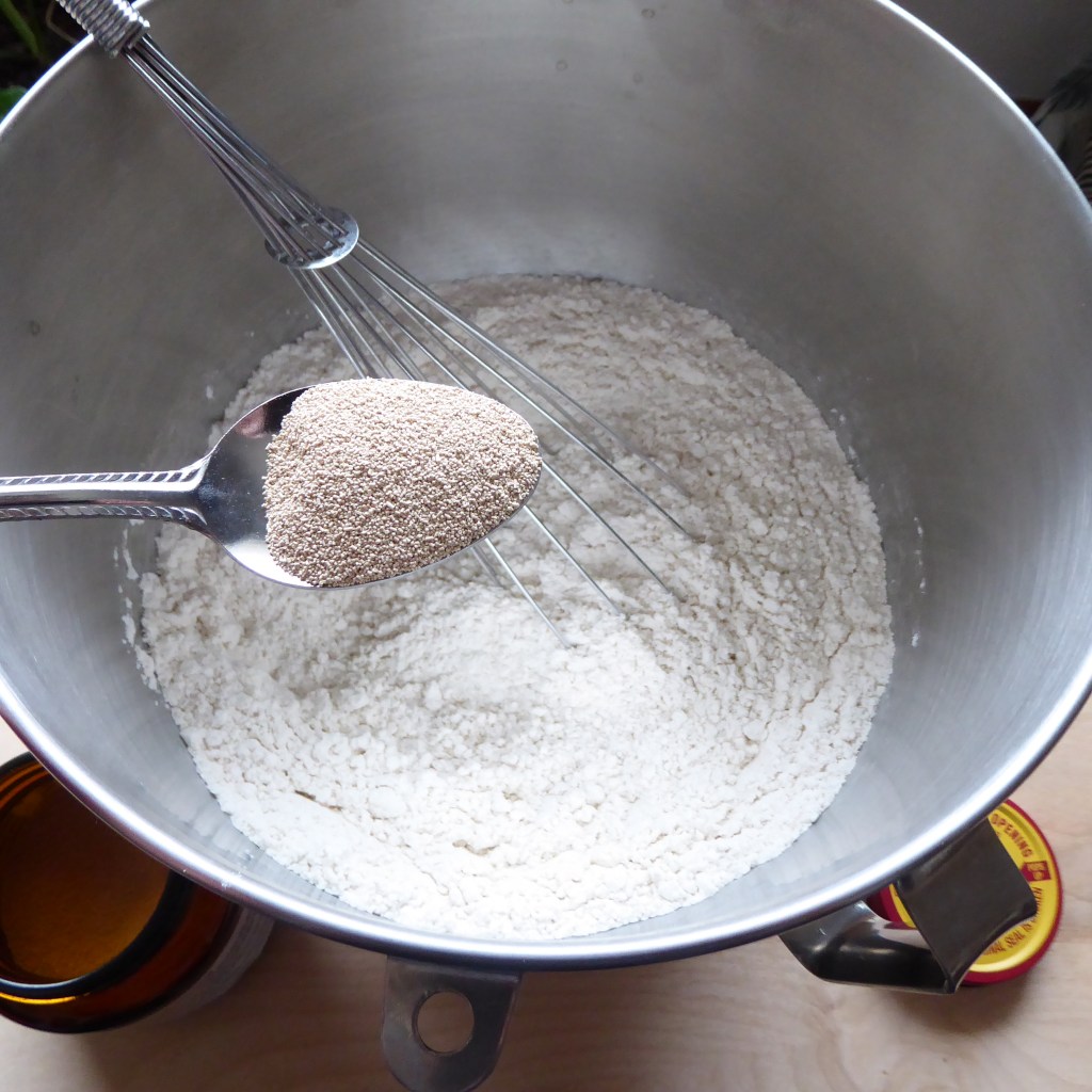 Start by mixing yeast and flour together in a large mixing bowl or bowl of your stand mixer.