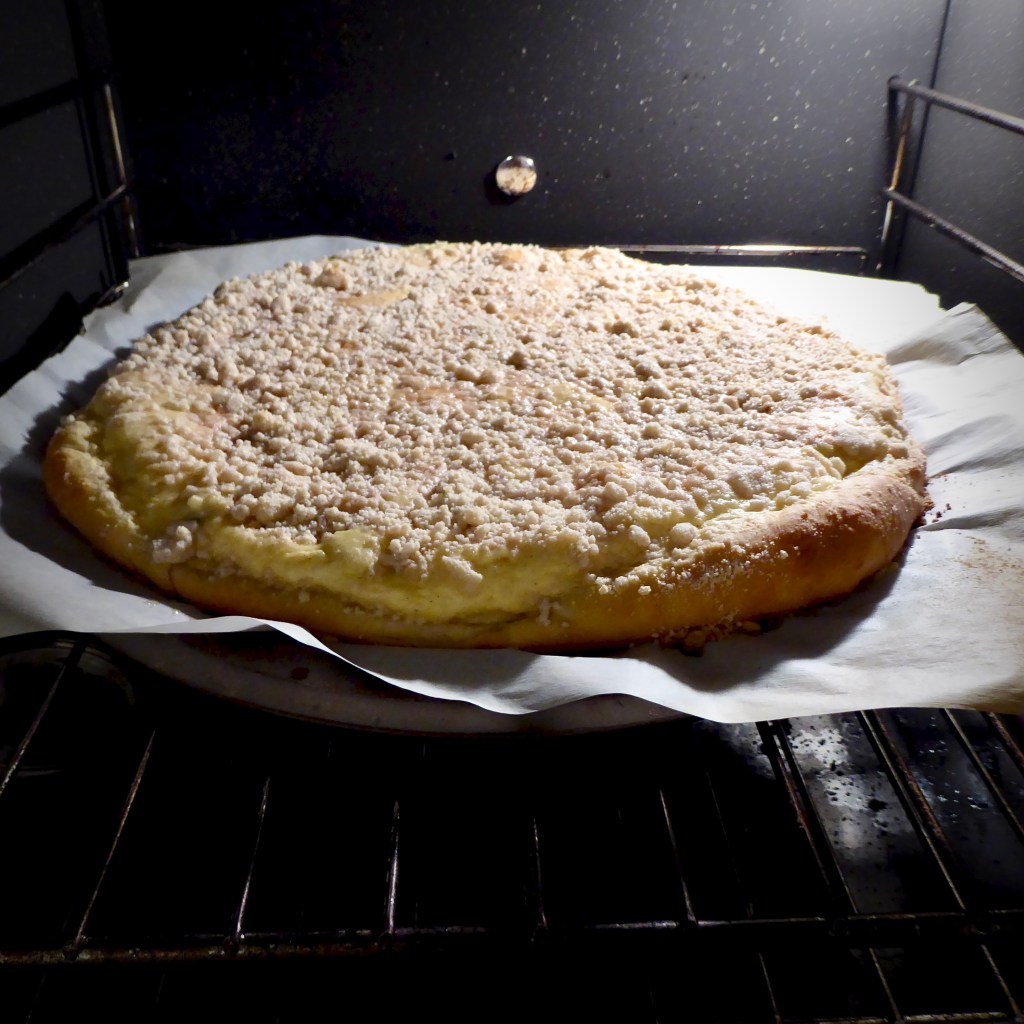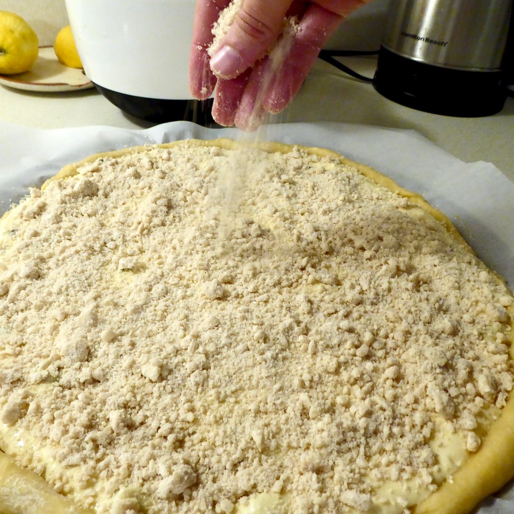 Preheat the oven to 375 F. Spread half the tvaroh mixture onto one of your pastries, make sure it’s even. Sprinkle (liberally) with posipka.