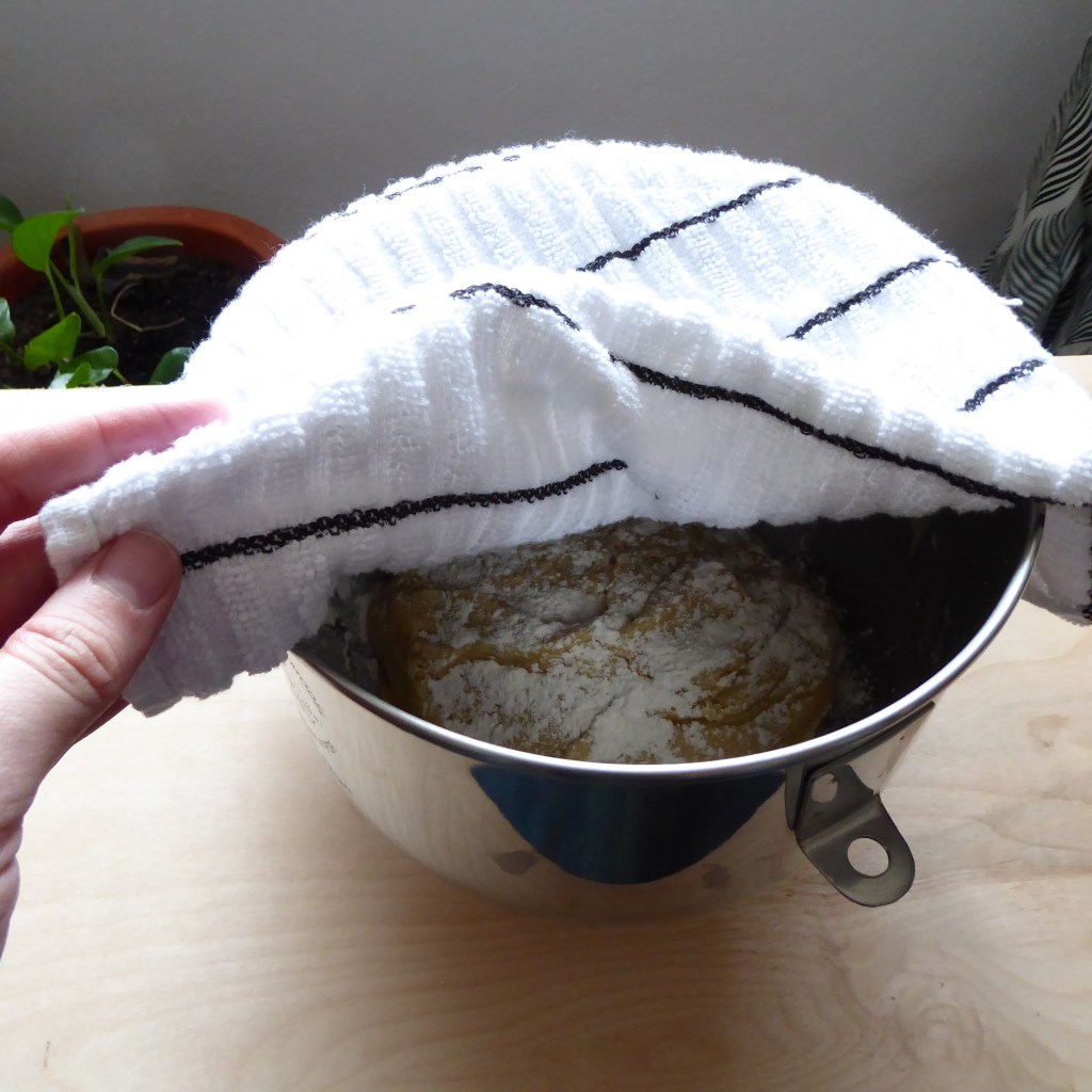 There you go! Now, scrape down the sides of the bowl, sprinkle a little flour over the top, cover (saran wrap or a cloth) and let rise in a nice warm spot. I usually use my window sill but it was pretty gloomy out today, so stuck it in a slightly warmed oven.
