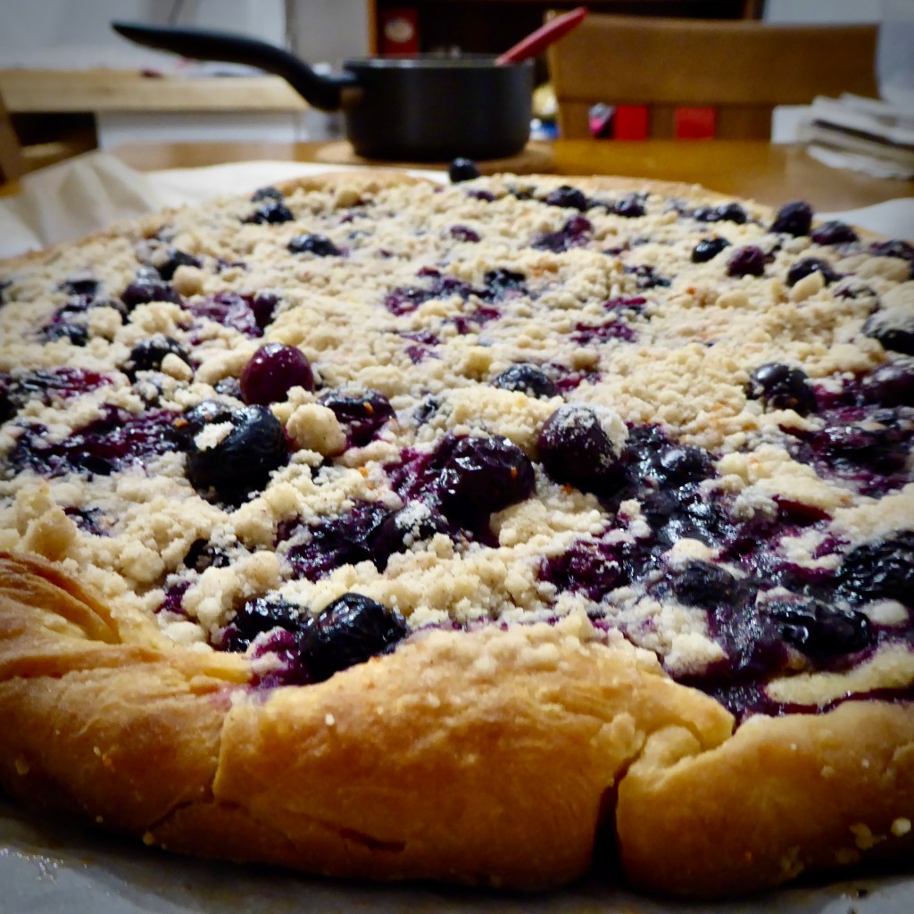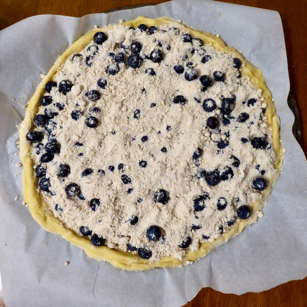 Preheat oven to 375 degrees F. Pour blueberries onto dough and spread evenly. Top with a liberal amount of streusel. Bake for 12-18 minutes, or until top is just slightly golden and edges are browned. Let cool on wire rack for 10 minutes. Slice with pizza cutter or large knife, and dig in!