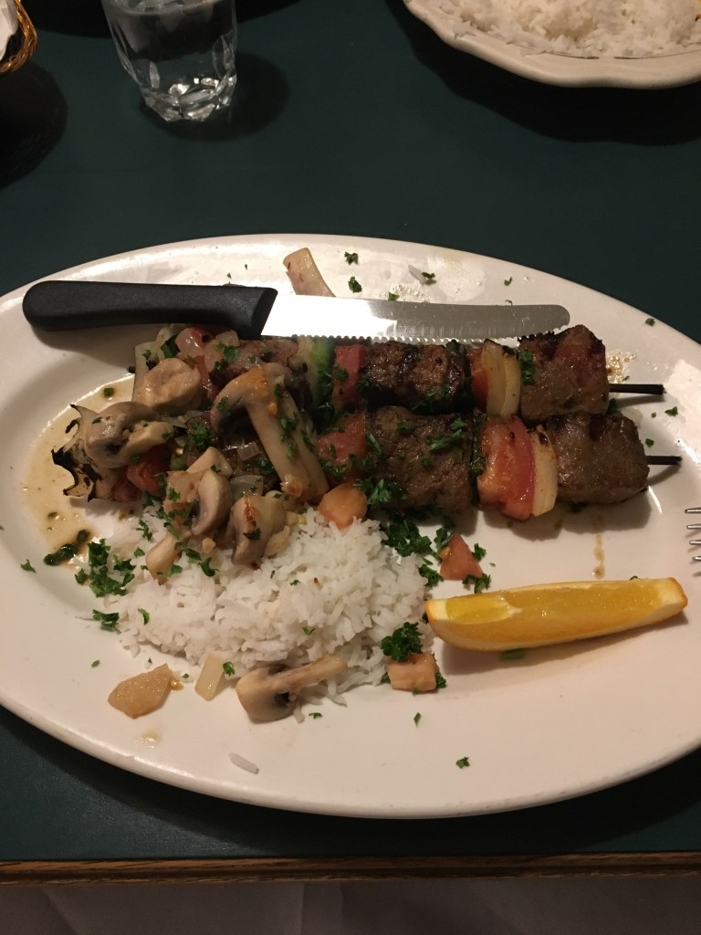 Espetinhos Gaucho – described as “charbroiled, sirloin beef kabobs with onions, tomatoes, and poblano peppers topped with a white wine, mushroom, and onion sauce; served with rice”