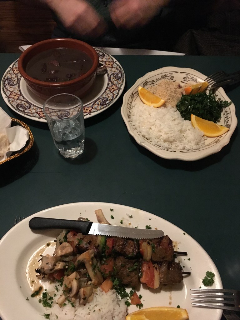 Kind of like a black bean soup with a bunch of fall-apart meat slow cooked inside; the waitress told us to take a spoon of stew, mix with rice and greens, and squeeze the orange slices over it – amazing.
